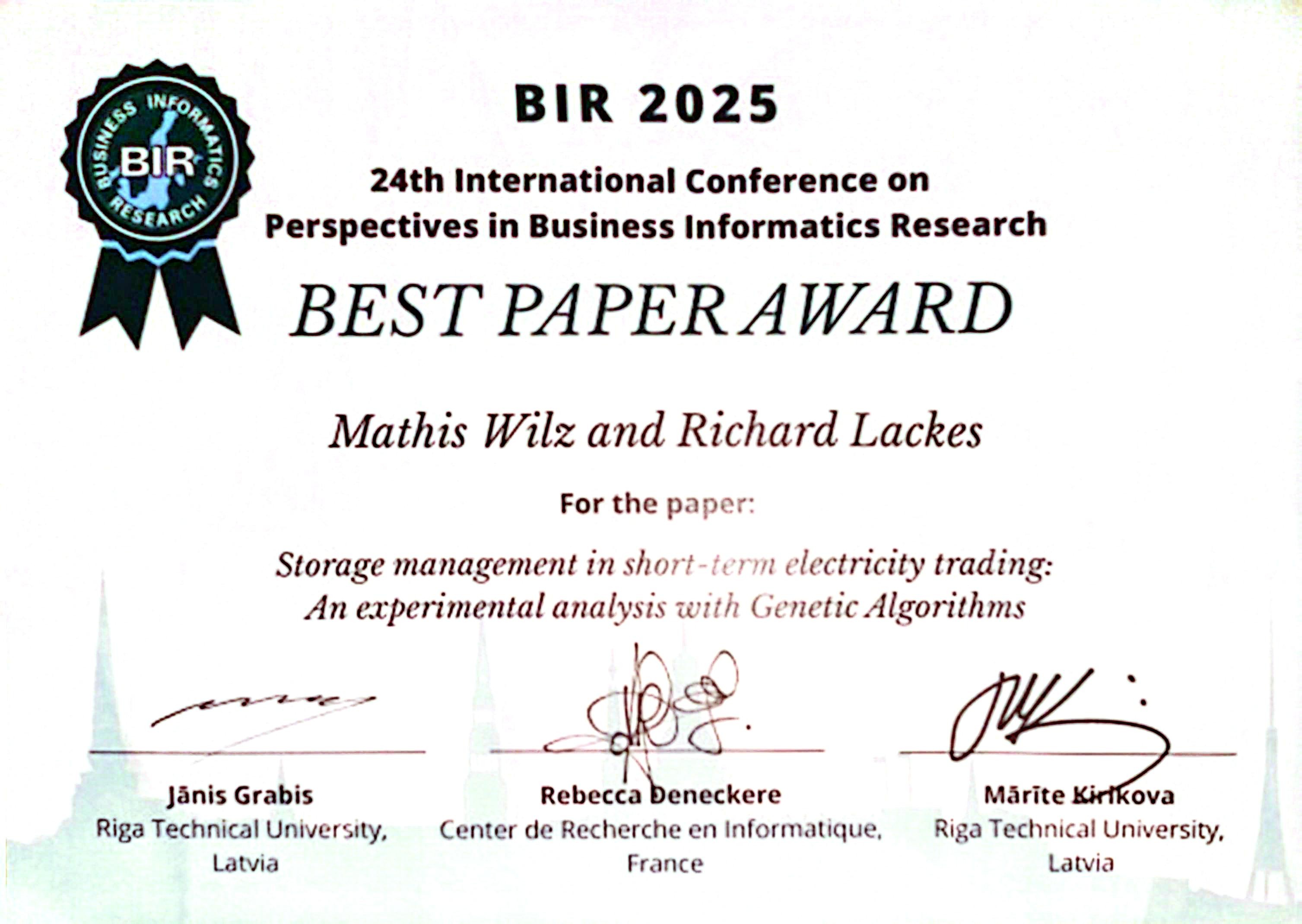 Türk-Alman Üniversitesi öğretim üyesi Prof. Dr. Richard Lackes ve doktora öğrencisi Mathis Wilz tarafından hazırlanan “Storage Management in short-term electricity trading: An experimental analysis with Genetic Algorithms” başlıklı makale, 19 Eylül 2025 tarihinde Letonya’nın Riga kentinde düzenlenen 24th International Conference on Perspectives in Business Informatics Research (BIR2025) kapsamında sunuldu.